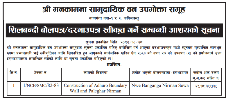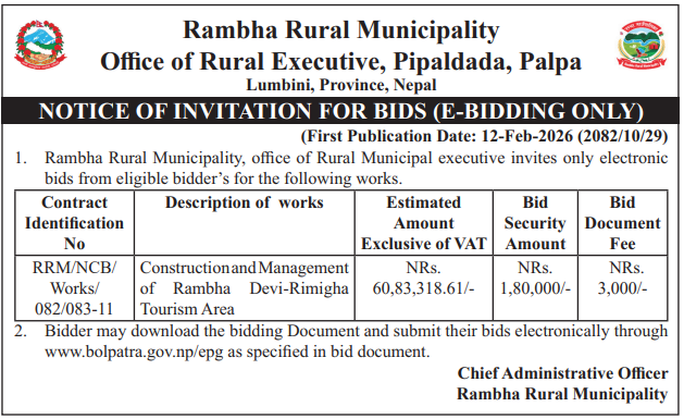 104 Rambha Rural Municipality, Palpa Construction and Management of Rambha Devi-Rimigha Tourism Area 12/02/2026 PPMO 15/03/2026 Click Here