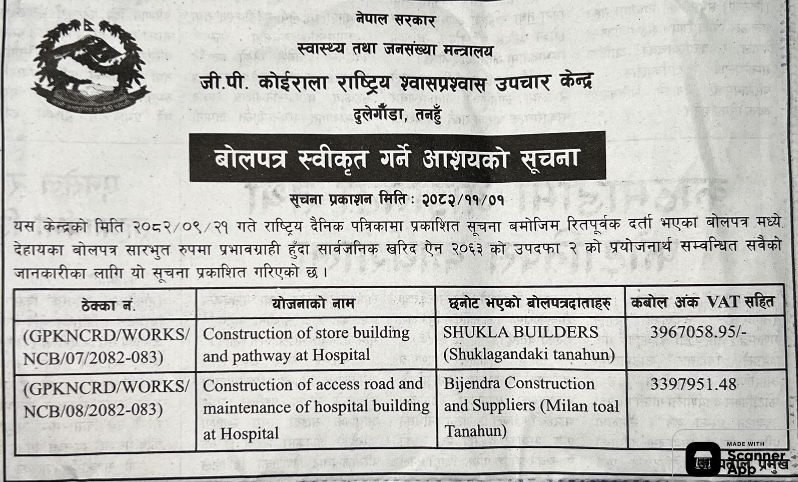 57 Godawari Municipality, Office of the Municipal Executive, Construction of Dukuchhap Health Center, Godawari Municipality-08, Dukuchhap, Lalitpur 12/02/2026 PPMO 15/03/2026 Click Here