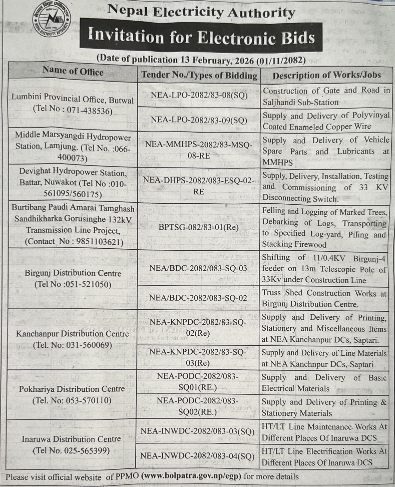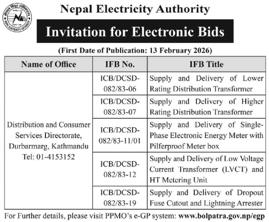 144 NEA, Okhaldhunga Distribution Center Supply and Delivery of Line Materials & Tools 12/02/2026 PPMO 27/02/2026 Click Here