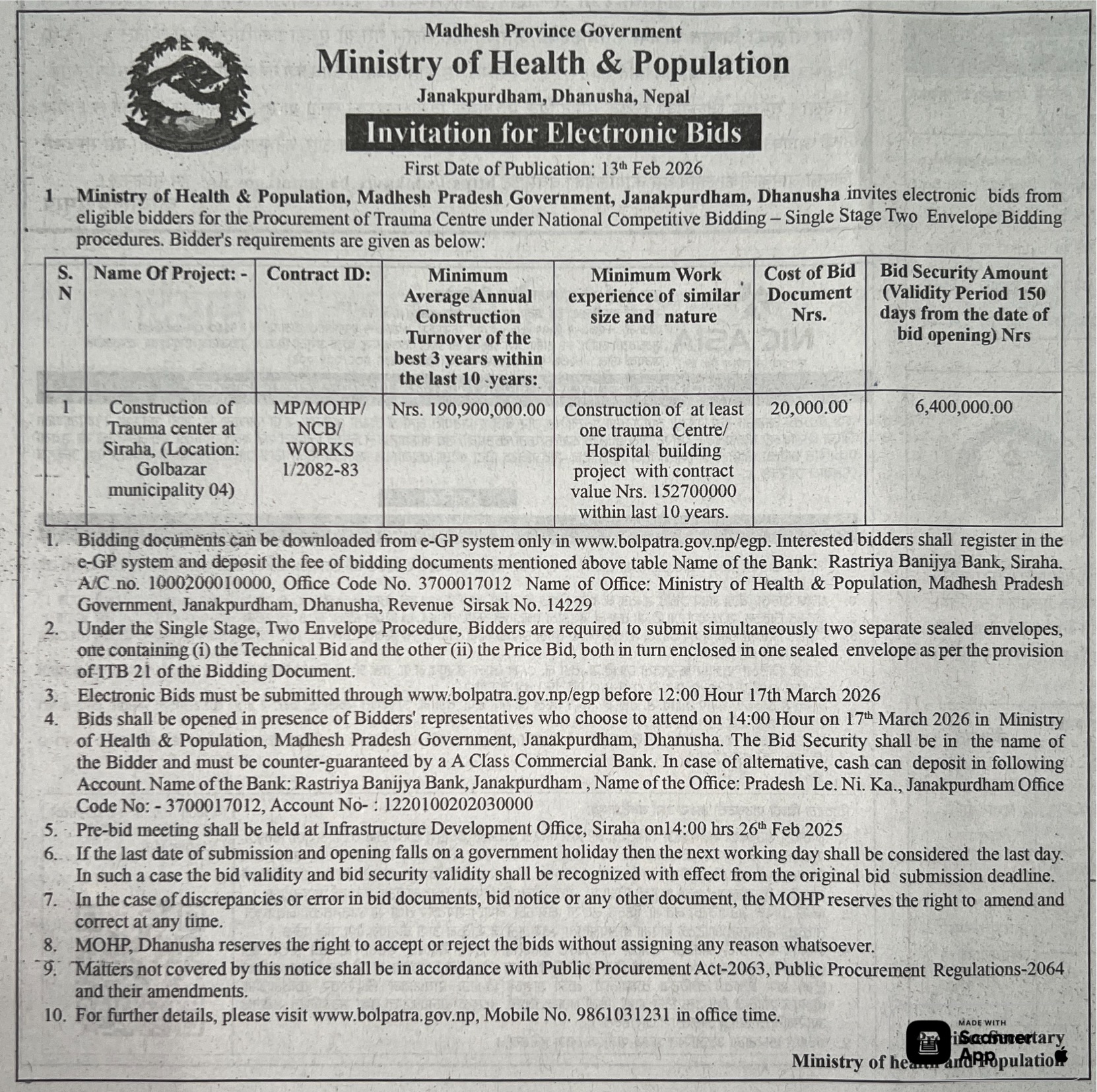 169 Health Office, Rupandehi The Procurement and Supply of NCD Equipment 12/02/2026 PPMO 15/03/2026 Click Here