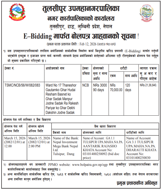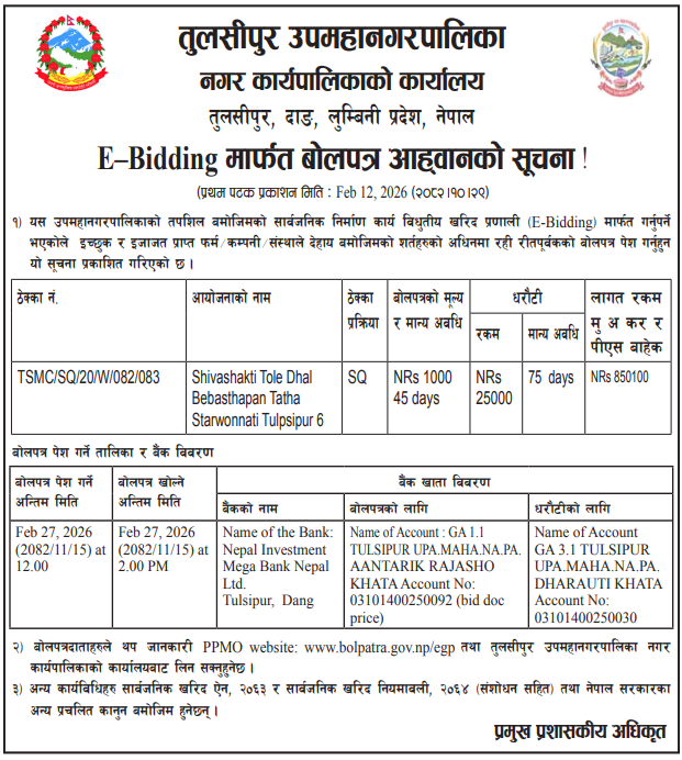 154 Tulsipur Sub-Metropolitian City Office, Lumbini Province, DANG; Shivashakti Tole Dhal Bebasthapan Tatha Starwonnati Ward No.1,Block No. 14,Tikapur,Kailali. 12/02/2026 PPMO 27/02/2026 Click Here