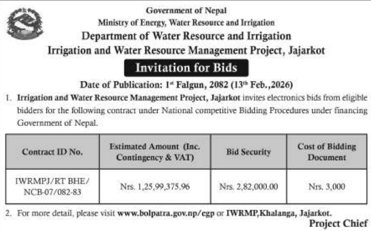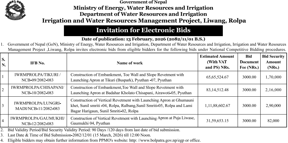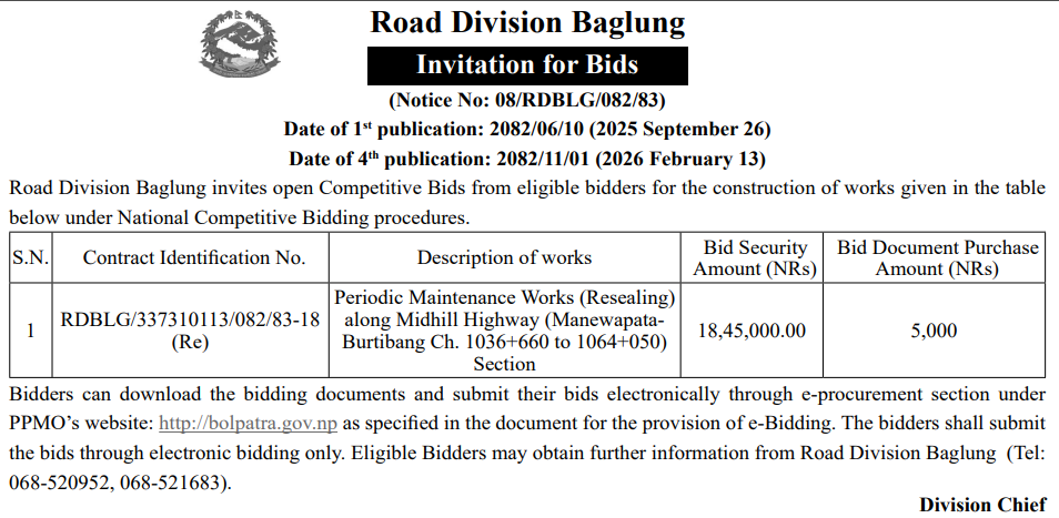 146 Road Infrastructure Development Office, Palpa Bhairabsthan Mandir Pahunch Marg Ribdikot Palpa 12/02/2026 PPMO 27/02/2026 Click Here