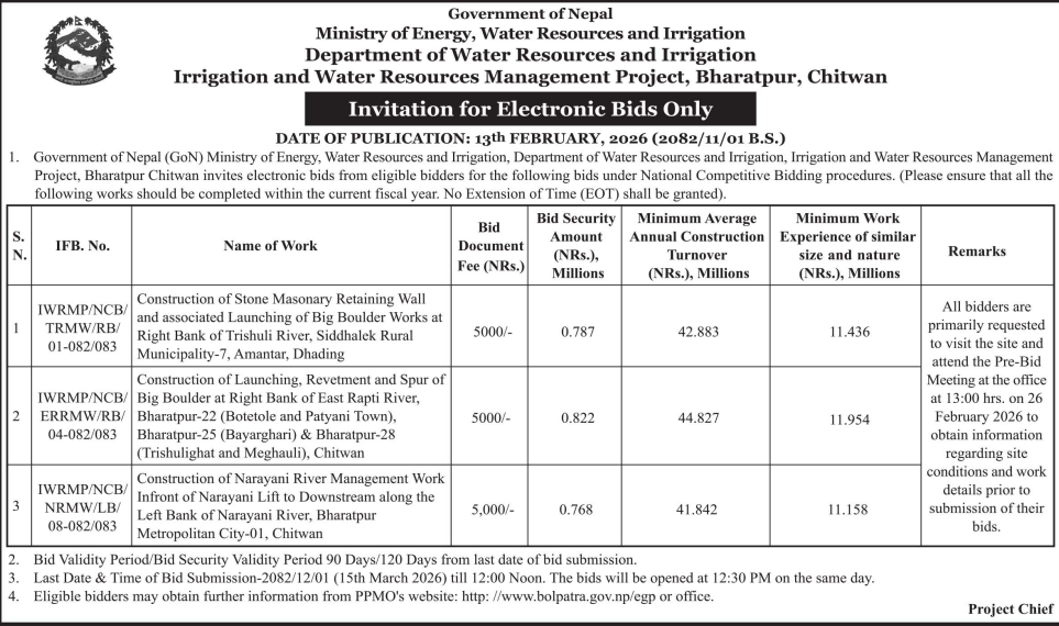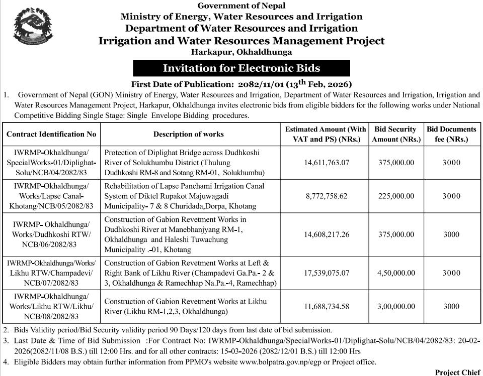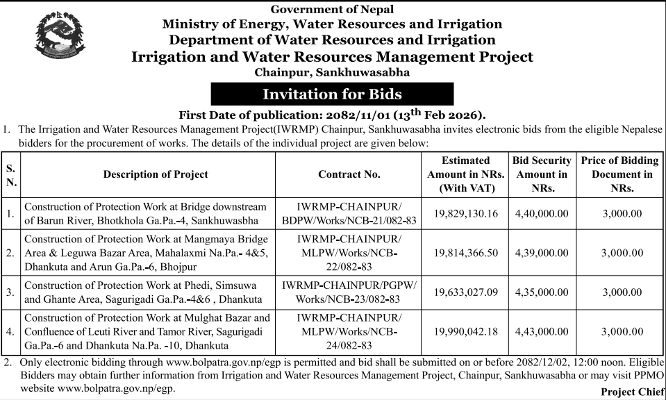 49 Bedkot Municipality Office, Sudurpaschim Province, KANCHANPUR; Bedkot na paa ko bibhinna kholaaharuko ( Kankatti ,Radha nadi,Pathariya nadi ra bagun nadi) maa tatabandhan nirman garne karya 12/02/2026 PPMO 15/03/2026 Click Here