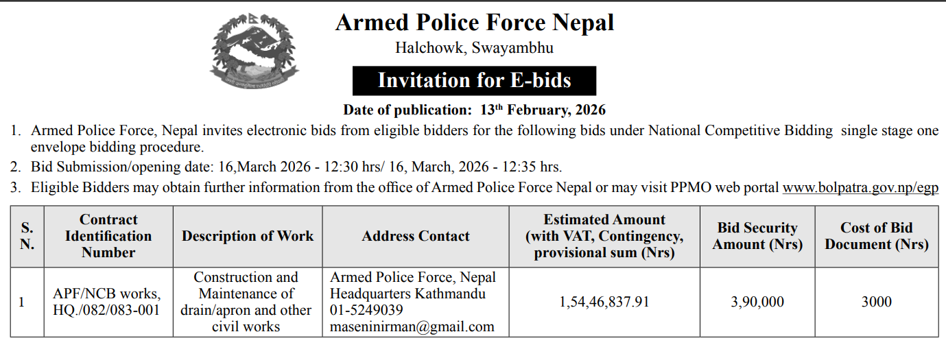 170 Nepal Police Headquarter Procurememt Section, Naxal Expansion of Nepal Police Computer Network Sites 12/02/2026 PPMO 15/03/2026 Click Here
