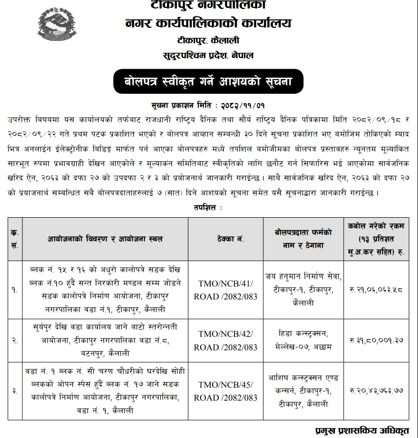 153 Tikapur Municipality Office, Sudurpaschim Province, KAILALI; Construction of Bitumineous Road ,(Way From Block No. 14 antargat uttar Bangaun Jane Culvert to Sagar Hotel Jane Road.),Tikapur Municipality Ward No.1,Block No. 14,Tikapur,Kailali. 12/02/2026 PPMO 27/02/2026 Click Here