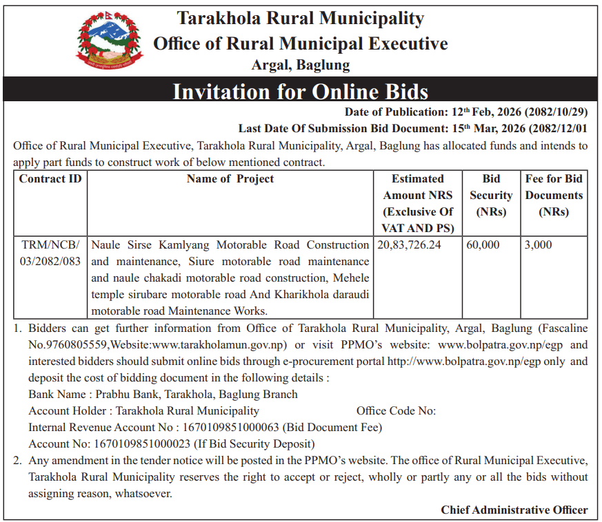110 Tara Khola Rural Municipality Office, Gandaki Province, BAGLUNG; Procurement Of Naule Sirse Kamlyang Motorable Road Construction and maintenance, Siure motorable road maintenance and naule chakadi motorable road construction, Mehele temple sirubare motorable road And Kharikhola daraudi motorable road Maintenance Works 12/02/2026 PPMO 15/03/2026 Click Here