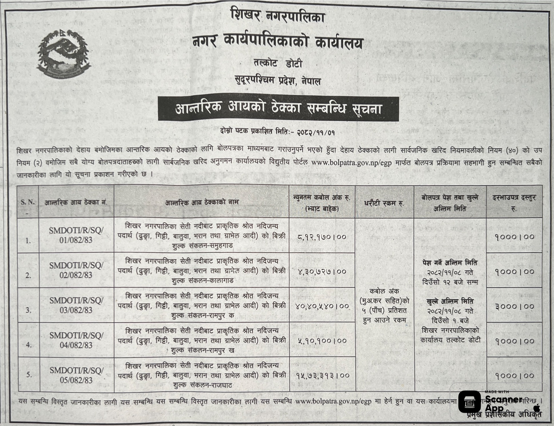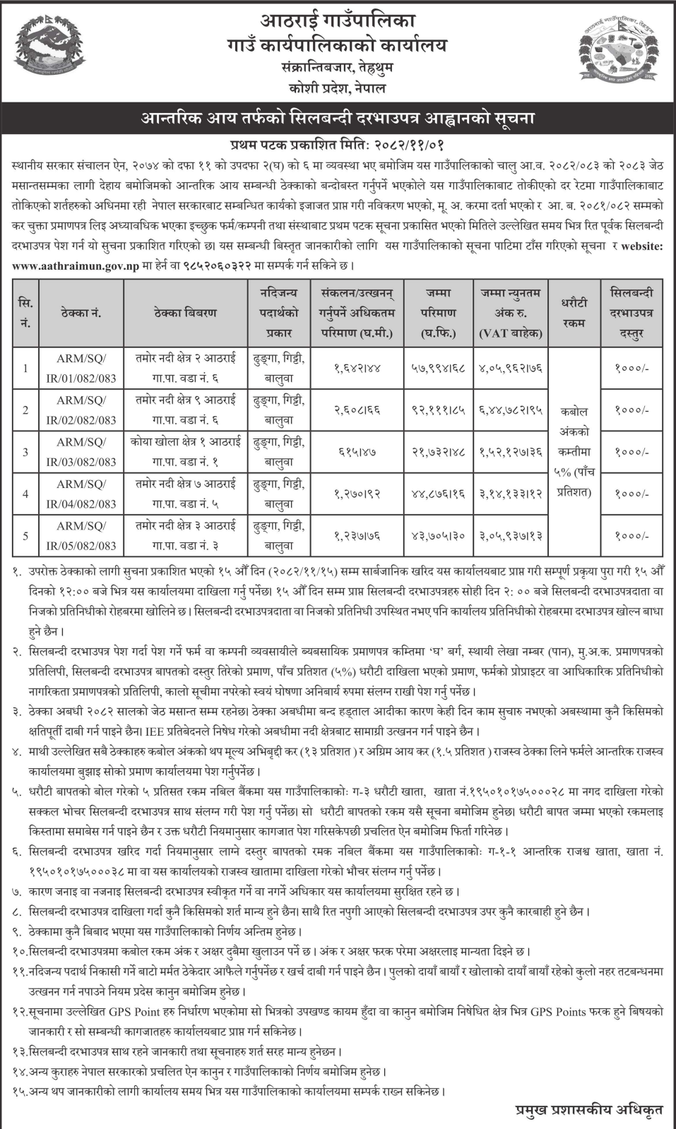 38 Gaindakot Municipality, Office of Municipal Executive Extraction and selling of River Bed Materials of Muralitar Chhetra, ward-07, Gaindakot Municipality FY: 082/83 12/02/2026 PPMO 15/03/2026 Click Here