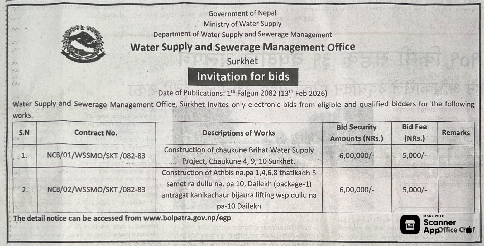 105 Rainadevi Chhahara Rural Municipality Office, Lumbini Province, PALPA; Construction of Different Water Supply Project at Rainadevi Chhahara Rural Municipality 12/02/2026 PPMO 15/03/2026 Click Here