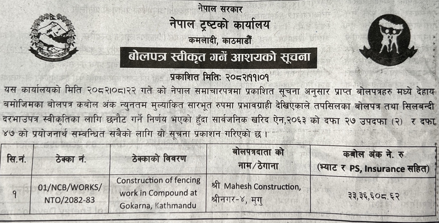 प्रदेश ३ मा प्रकाशित निर्माण सम्बन्धी बोलपत्र तथा आशयका सुचनाहरु