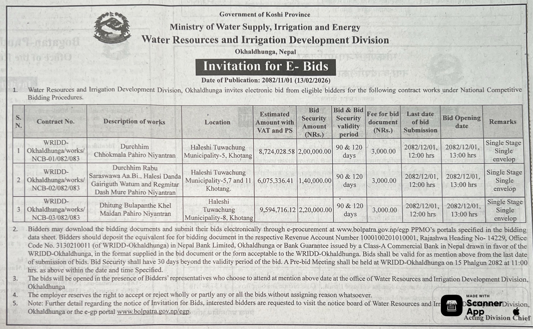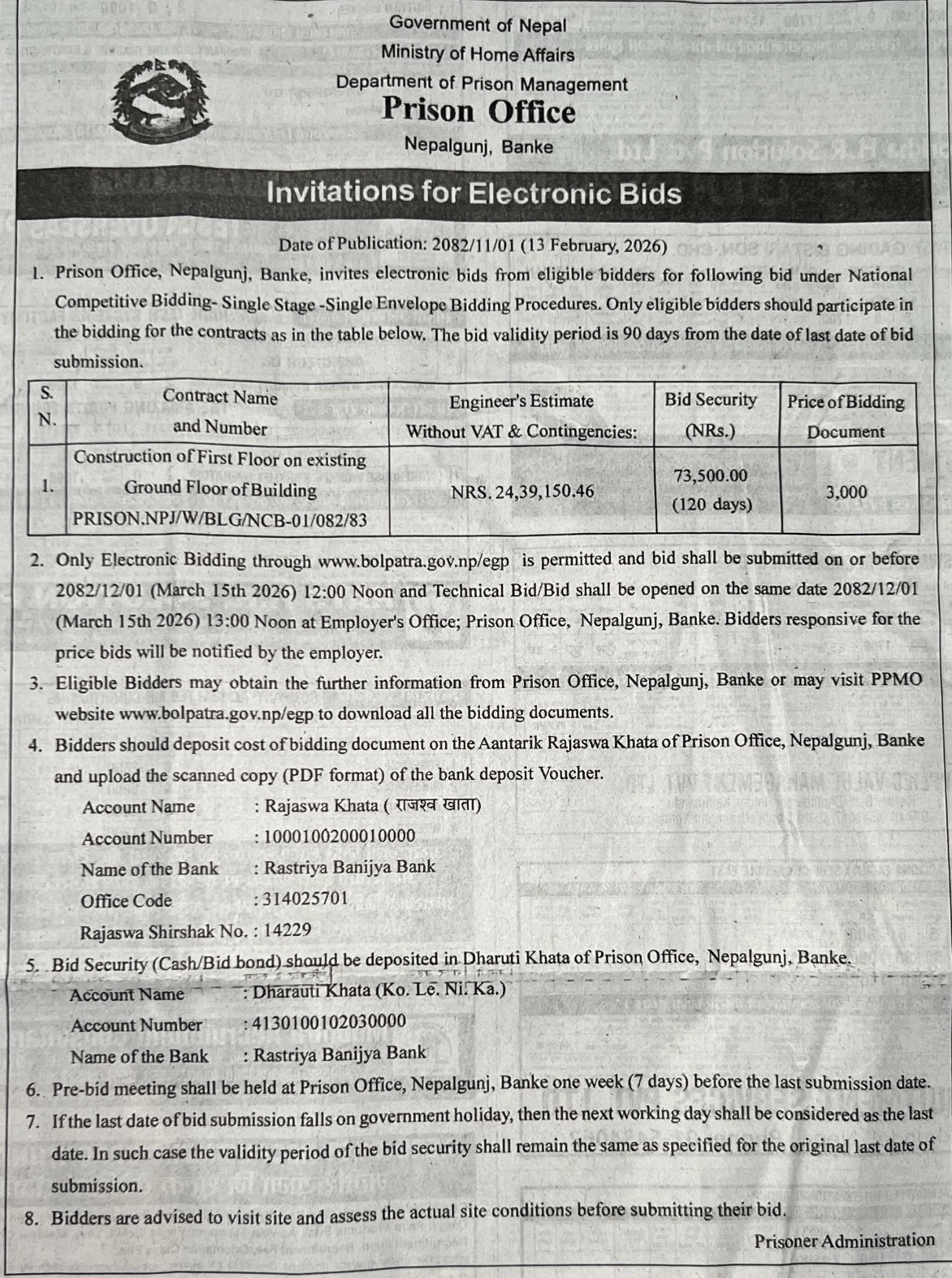 143 NEA, Bhairahawa Distribution Center LT Line Rehabilitation and Phase addition work at Dhakdhai Branch and Different place of Bhairahawa DCS. 12/02/2026 PPMO 27/02/2026 Click Here
