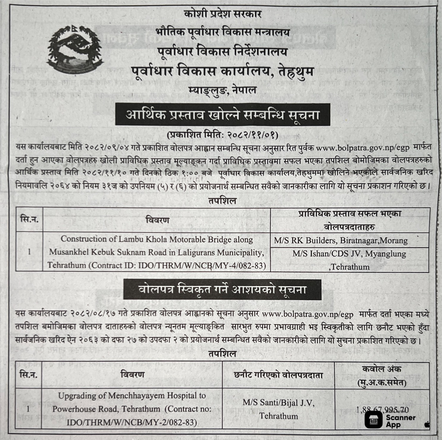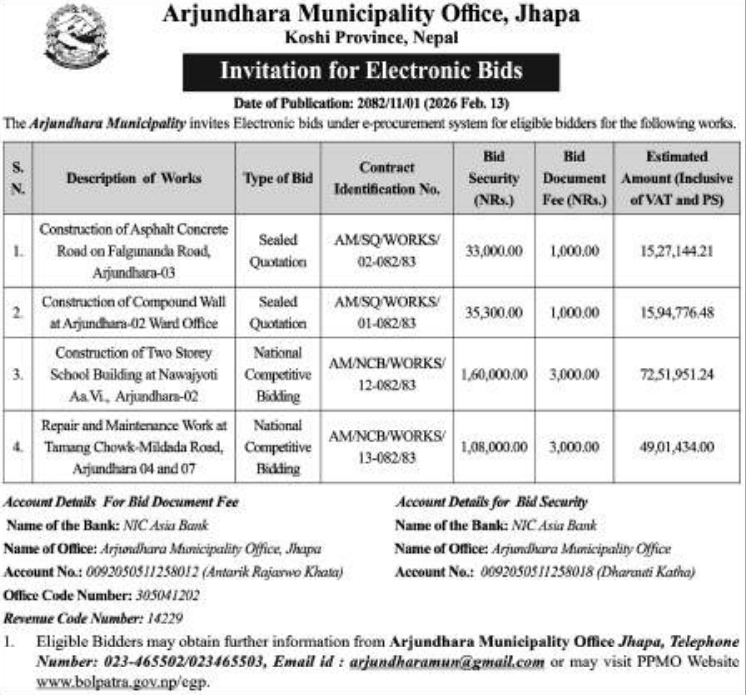 135 Infrastructure Development Office,Illam Upgrading of Bagarey Kharbani BP Marga and Subash Nemwang Marga road at Mangsebung 6 Ilam 12/02/2026 PPMO 27/02/2026 Click Here