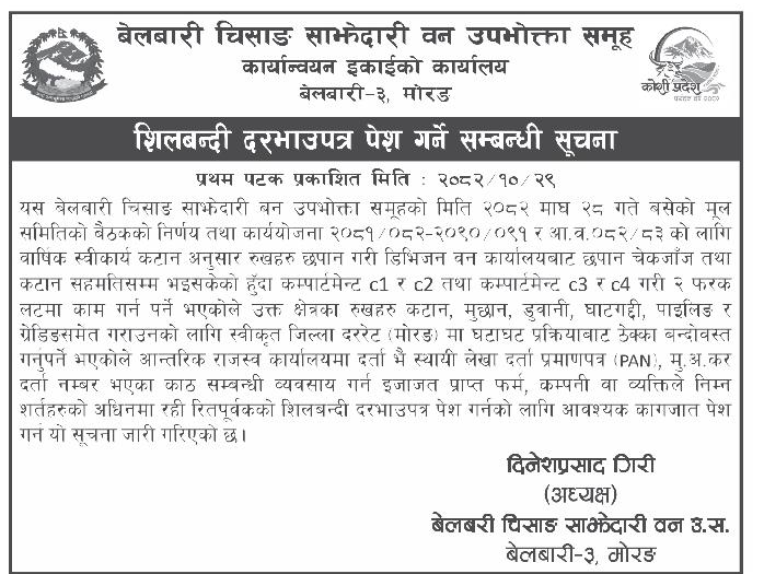 53 Division Forest Office, Dolpa Chhachu Dekhi Ragabachila Mandir Samma Sidi Sahitko Paryatakiya Pathmarga Jagadulla-4, Dolpa 12/02/2026 PPMO 15/03/2026 Click Here