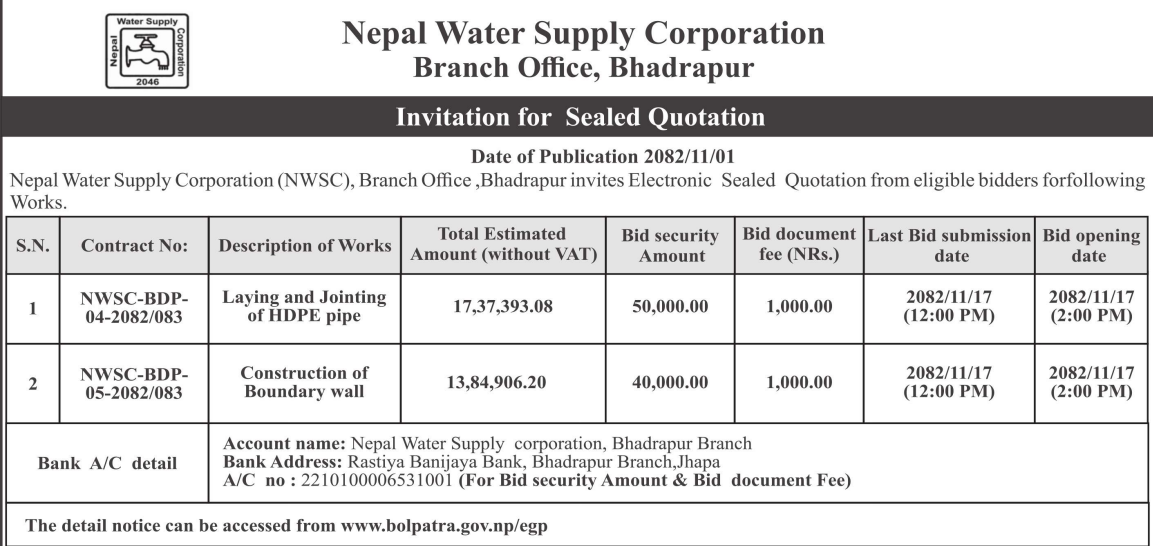 183 Water Supply & Sewerage Management Office, Khotang Procurement supply & Delivery of PE 100 PN series pipes at WSSMO Khotang, Diktel office 12/02/2026 PPMO 27/02/2026 Click Here