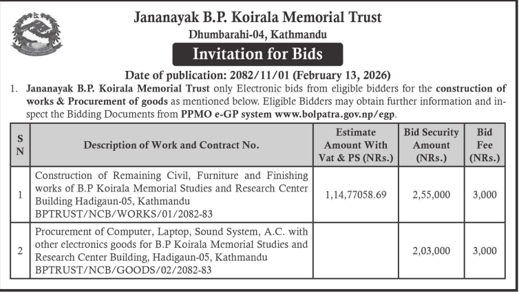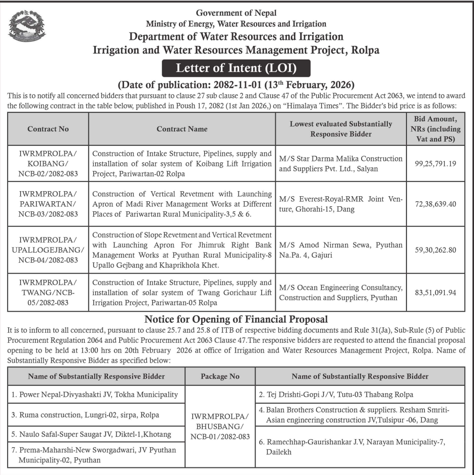 निर्माण सम्बन्धी प्रकाशित सम्पूर्ण ठेक्का टेन्डर तथा बोलपत्र सुचनाहरु प्रदेश अनुसार 13/02/2026 (Friday)
