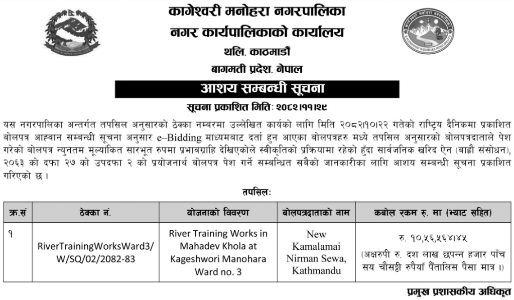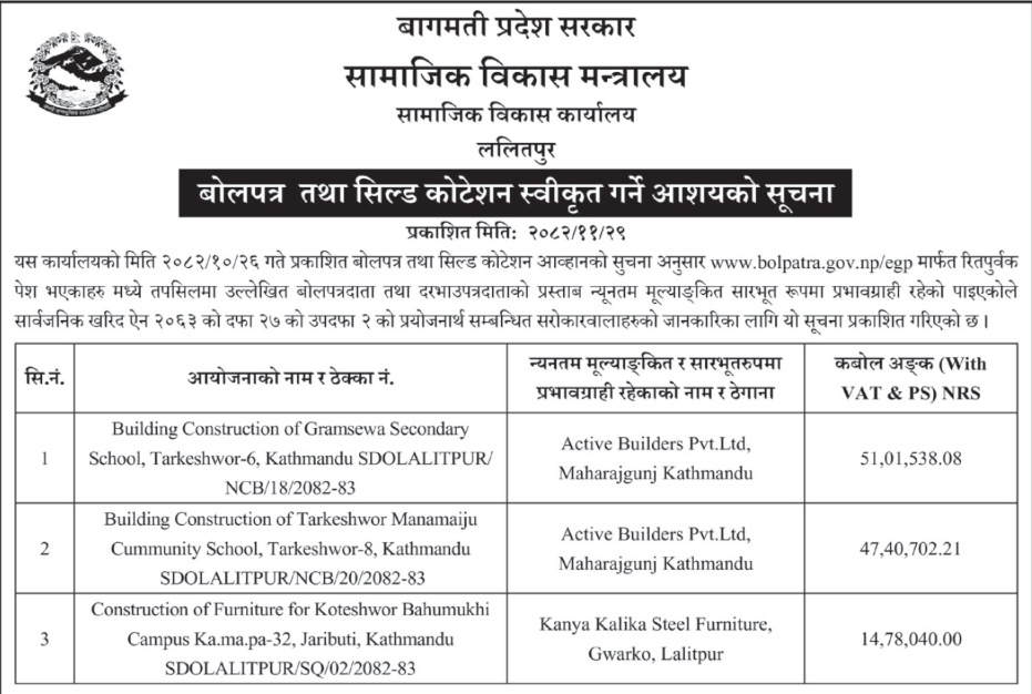 प्रदेश ३ मा प्रकाशित निर्माण सम्बन्धी बोलपत्र तथा आशयका सुचनाहरु