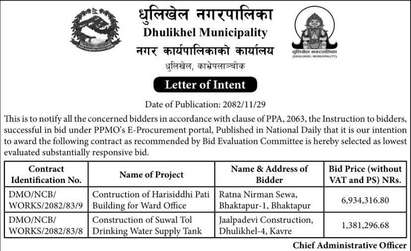 | 97 | Dhulikhel Municipality, Dhulikhel, Kavre | Retrofitting works of Harisiddhi School Library (Phase-II) | 12/03/2026 | PPMO | 27/03/2026 | Click Here | |