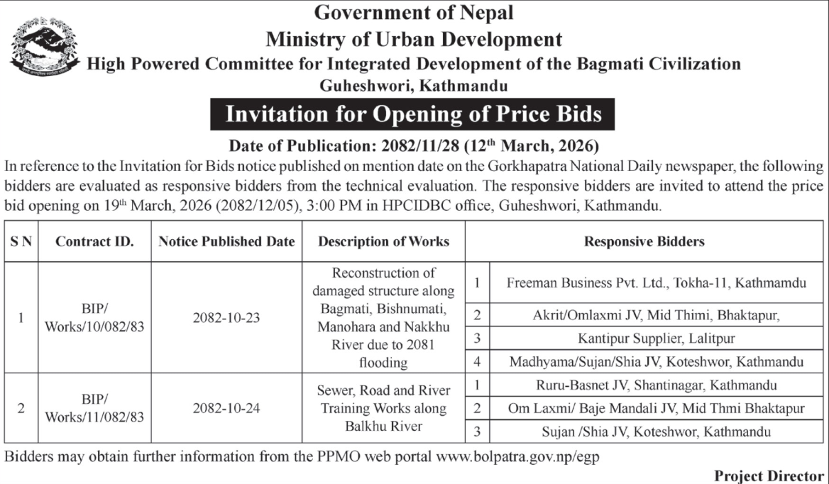 | 60 | Division Forest Office Kapilvastu (Gautambuddha) | River Management, Collection, Stockpiling and Selling of River bed materials from Surahi Khola (Section C), Shivaraj-02, Kapilvastu | 12/03/2026 | PPMO | 29/03/2026 | Click Here | |