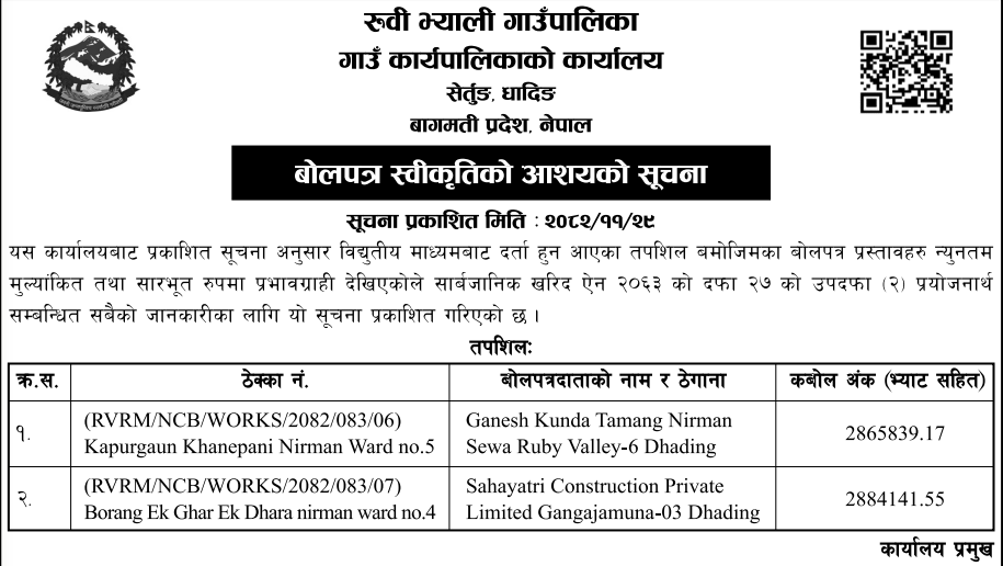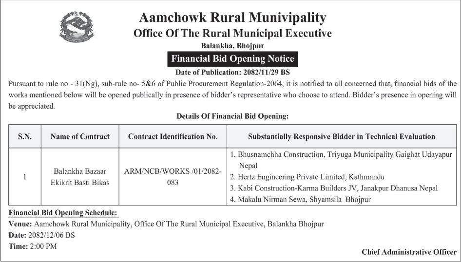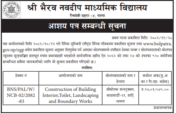 | 47 | Bijayanagar Rural Municipality Office, Lumbini Province, KAPILBASTU; | Loharaula Hatbazarma Sauchalaya Niraman tatha Hulaki batoko chheuma bibhinna thauma PCC dhalan,Lharaula haat bazar byawasthapan samiti(Sauchalaya Nirman),Lorahaula Gaun Paschim Jane Sadak Starunnati Ward no 2, Mukesh Bhar ko ghar dekhi uttar bato samma sadak starunnati bagahiya, Mauwadudhar gaunbhitra PCC dhalan | 12/03/2026 | PPMO | 29/03/2026 | Click Here | |
