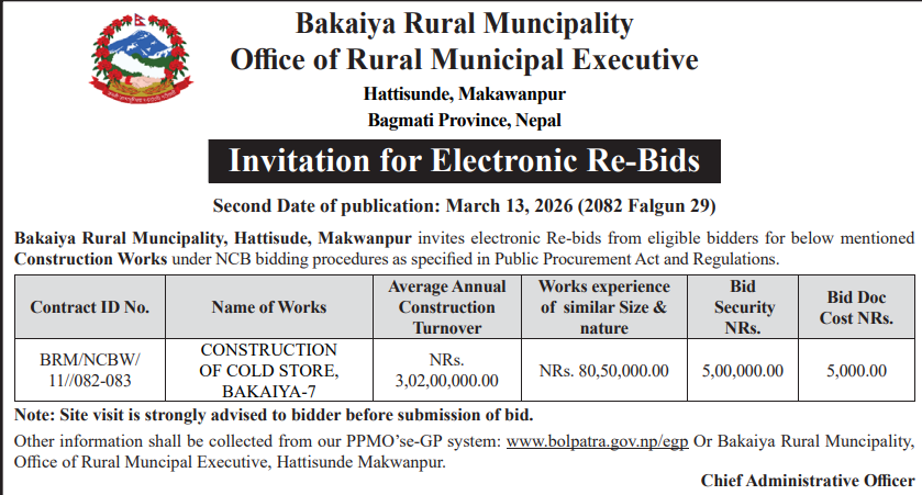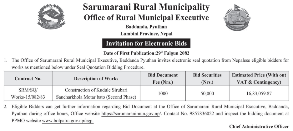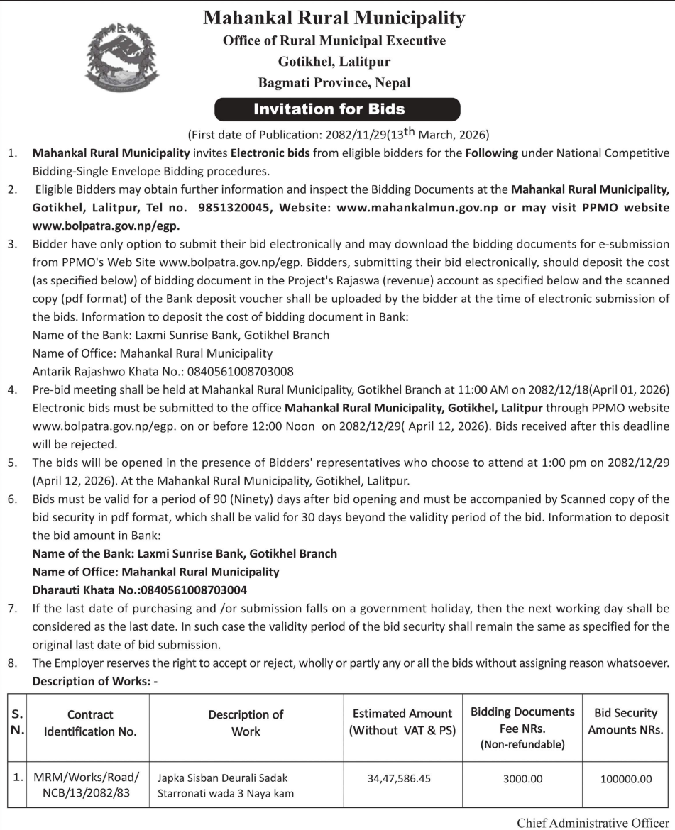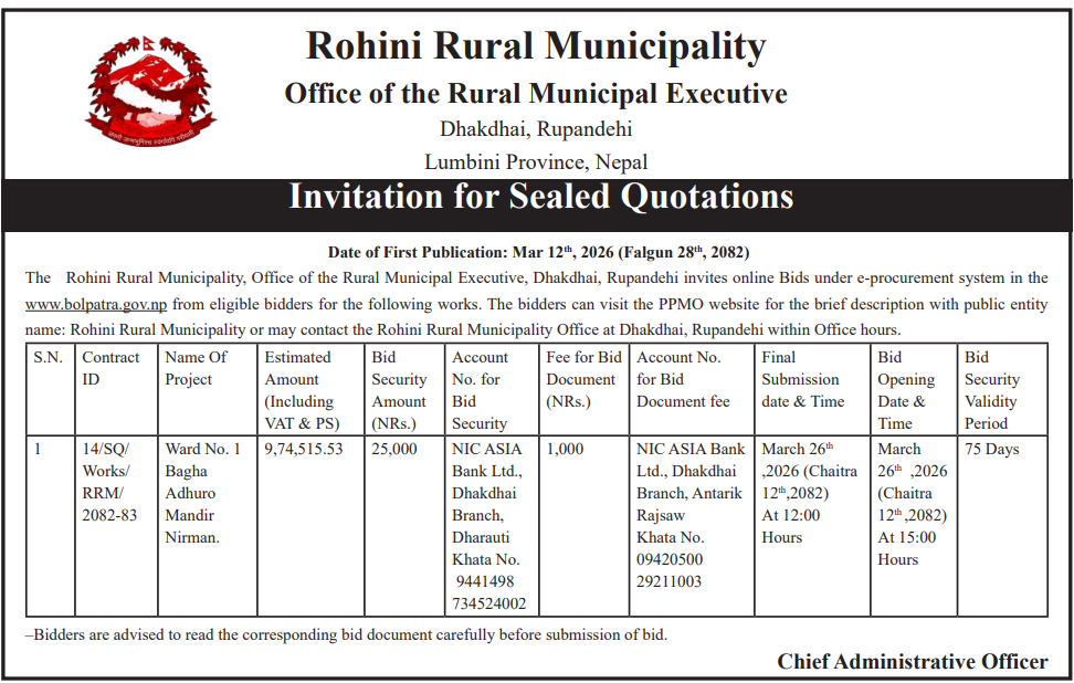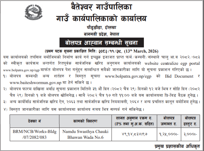 | 48 | Bijayanagar Rural Municipality Office, Lumbini Province, KAPILBASTU; | Padariya Samaymai Marmat,Bagahiya Samaimai than marmat tatha tin chaune kam,Dudhadhari Baba Mandir Stage Nirman Gugauli,Imlikharka Chaupari Nirman,Padarauna Samudayik Bhawanma Sauchalaya Nirman tatha PCC,Imlikharka Mandir Jane Batoma Culvert Nirman,Madhwanagar PCC Dhalan | 12/03/2026 | PPMO | 29/03/2026 | Click Here | |