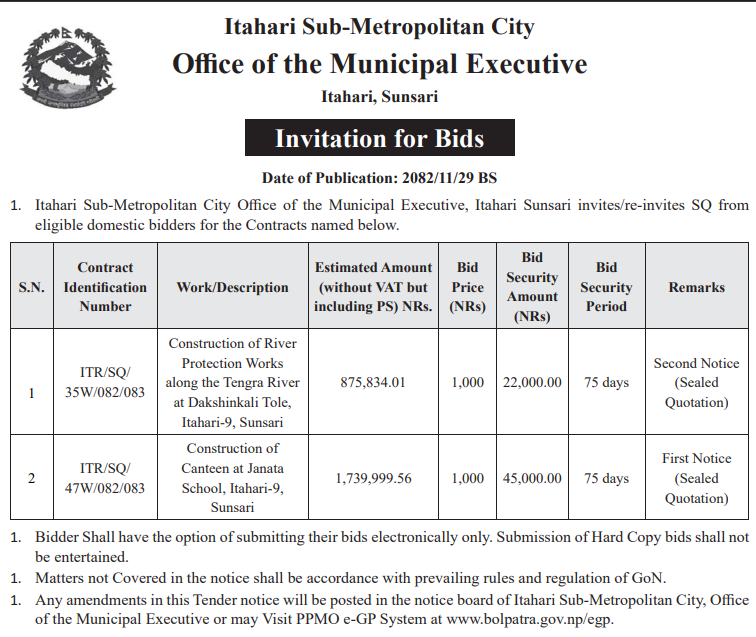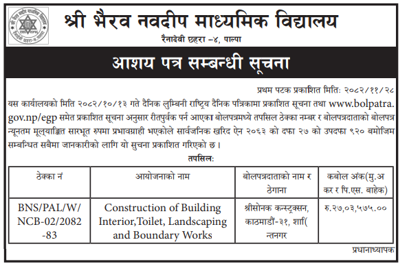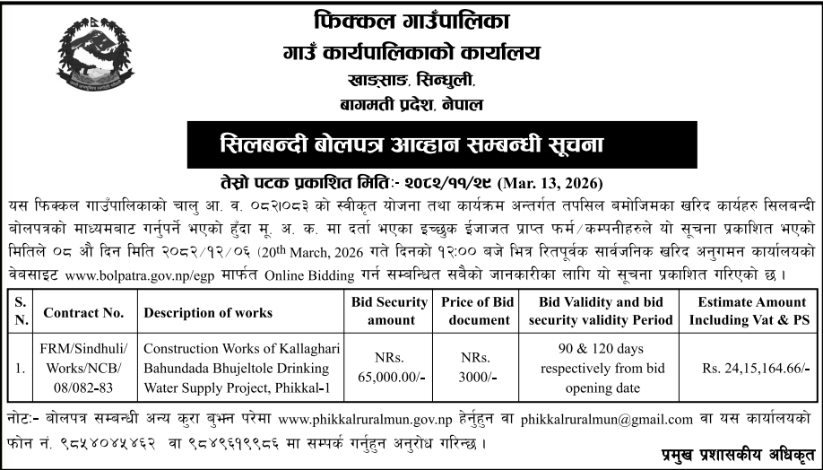 | 45 | Bijayanagar Rural Municipality Office, Lumbini Province, KAPILBASTU; | Patthardaiya Jal Upbhokta Sansthako Nahar Sarsafai Tatha Fatak Nirman, Patthardaiya Durga mandir Adhuro Dharmshala Boundary wall Nirman, Patthardaiya Masanghatma Pratikchhalay Nirman, Kadhiyar Adhuro Samudayik Bhawan Nirman, Kadhiyar Samaymai Than Tarbar & Jagdishpur Khel Maidanma Wall Nirman Tatha Mato Patan | 12/03/2026 | PPMO | 29/03/2026 | Click Here | |