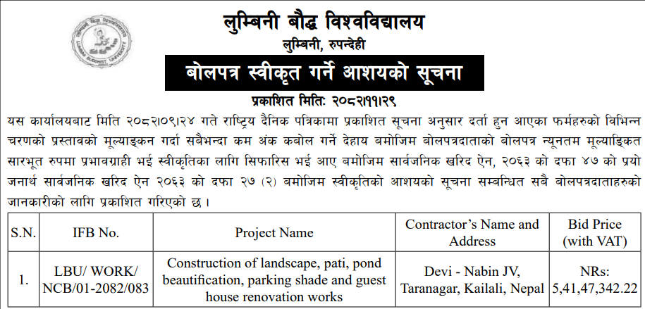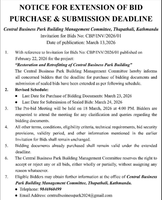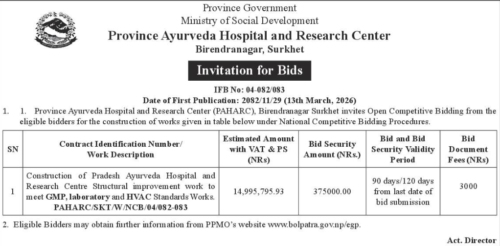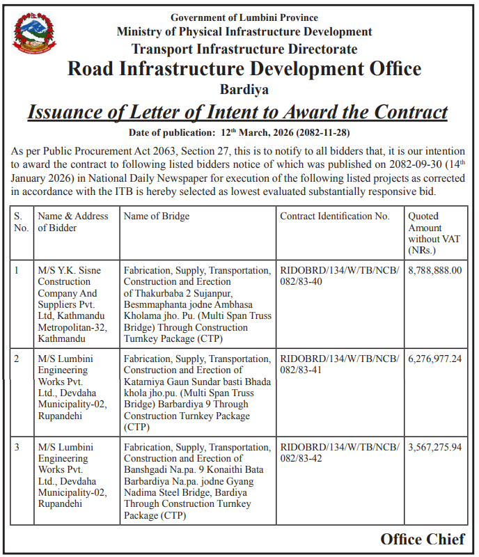 | 112 | DUDBC, FPIU, Banke | Maintenance and Rehabilitation of fire damaged Banke District Court Building, Nepalgunj. | 12/03/2026 | PPMO | 20/03/2026 | Click Here | |
