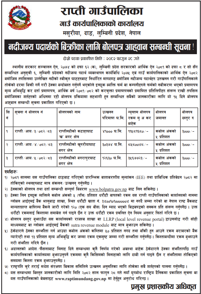 | 85 | Rapti Rural Minicipality, Dang | Rapti Nadiko Khururiya Ghat Bagar chhetra | 12/03/2026 | PPMO | 29/03/2026 | Click Here | |