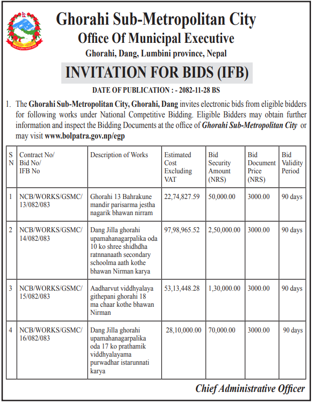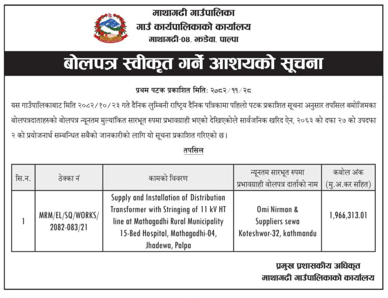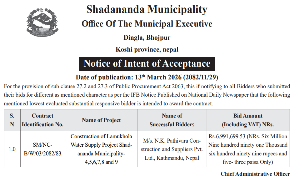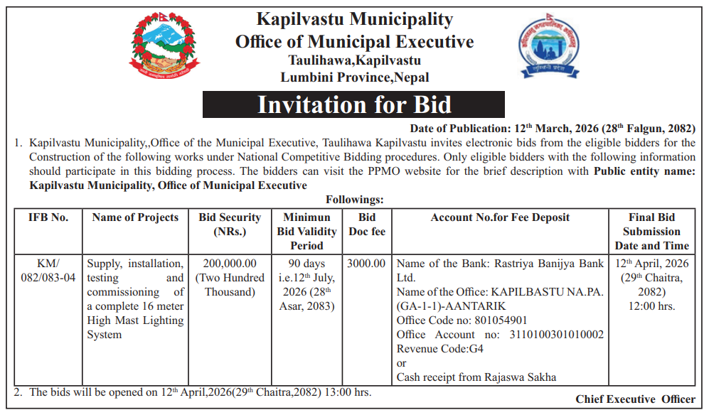 | 27 | Kapilvastu Municipality, Office of Municipal Executive | Supply, installation, testing and commissioning of a complete 16 meter High Mast Lighting System | 12/03/2026 | PPMO | 12/04/2026 | Click Here | |