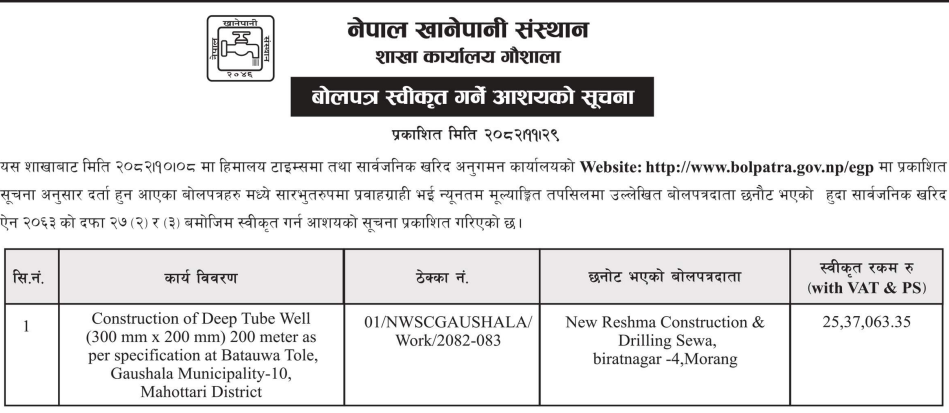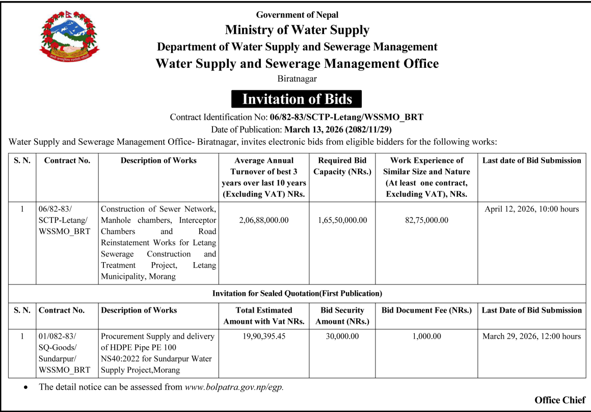| 30 | SHIVA DAL BN | 160M. Deep Boring works at Purbi Pritana Talim Shikshyalaya Letang Morang. | 12/03/2026 | PPMO | 12/04/2026 | Click Here | |
