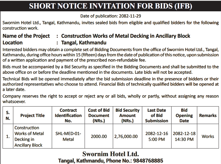 | S.N. | Caller's Name and Address | Items/Services | Published Date | Source | Submission Date | View Document | |