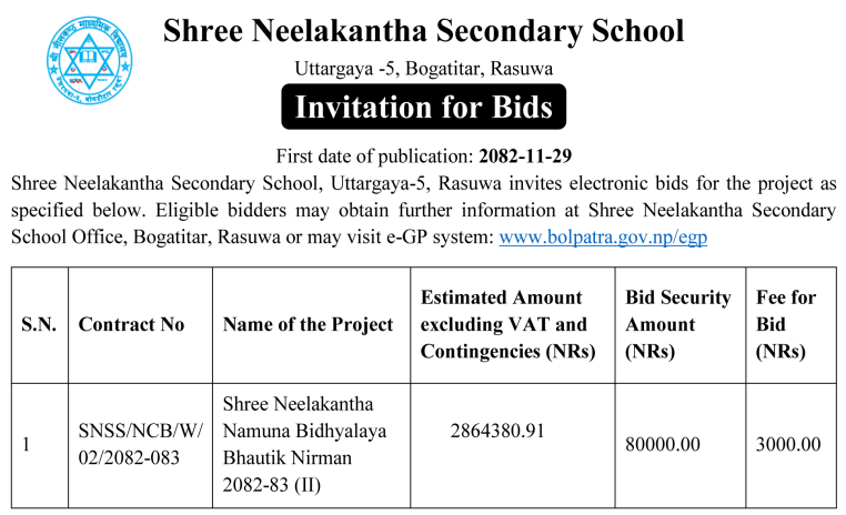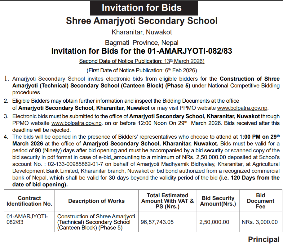 | 72 | Bharatpur Metropolitian City Office | Construction of Saraswoti Mandir at Bishwoprakash Secondary School, BMC-15 | 12/03/2026 | PPMO | 29/03/2026 | Click Here | |