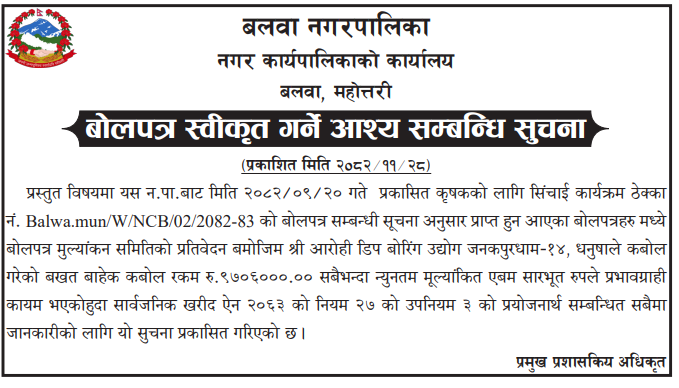 | 4 | Bardaghat Municipality Office, Lumbini Province, NAWALPARASI WEST; | Procurement of Construction of Nawalparasi Jilla Bardaghat Nagarpalika-06,Betahani Manoranjan Park | 12/03/2026 | PPMO | 12/04/2026 | Click Here | |