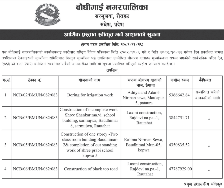 | 28 | Madhav Narayan Municipality, Office of the Municipal Executive | Construction of Secondary School Building Madhopur ward no 6 | 12/03/2026 | PPMO | 12/04/2026 | Click Here | |