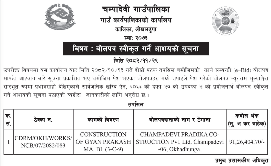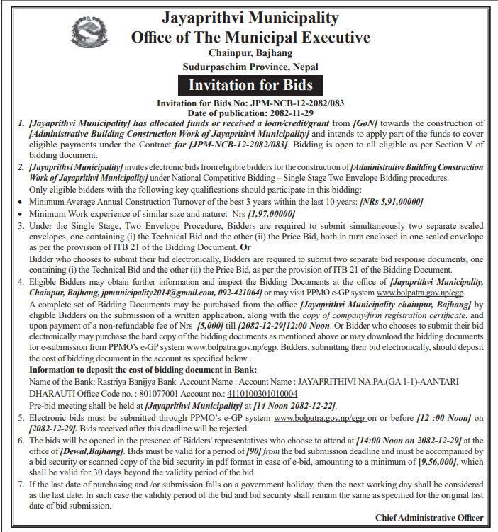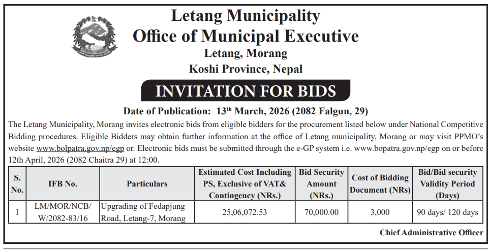 | 49 | Chaudandigadhi Municipality Office, Koshi Province, UDAYAPUR; | Puma tupkha bankhala ko bhawan nirman, Chaudandigadhi ward no.7 | 12/03/2026 | PPMO | 29/03/2026 | Click Here | |