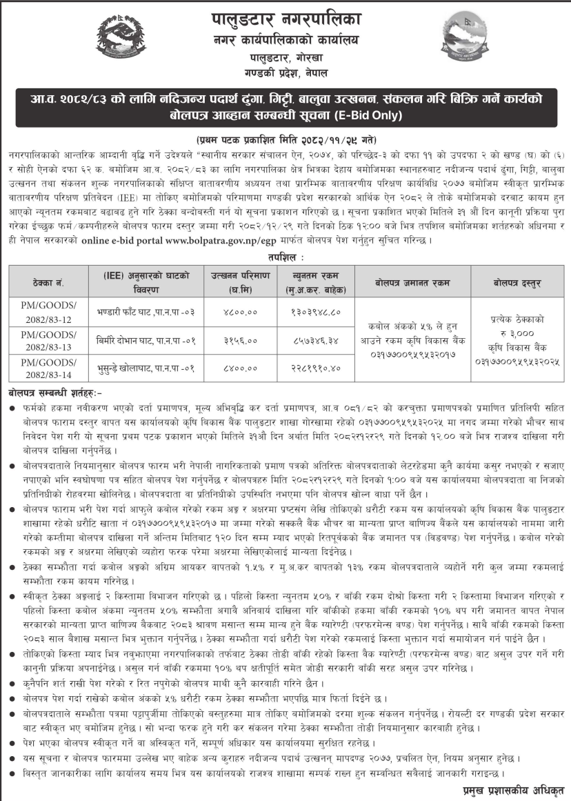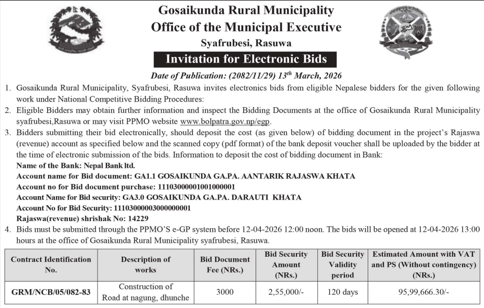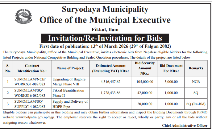 | 15 | IDOKASKI | Jogimani Tumke Ghatte Kuna Nala to Nala Pitch and Kalmuda Road Upgradation, Pokhara-16, Kaski | 12/03/2026 | PPMO | 12/04/2026 | Click Here | |