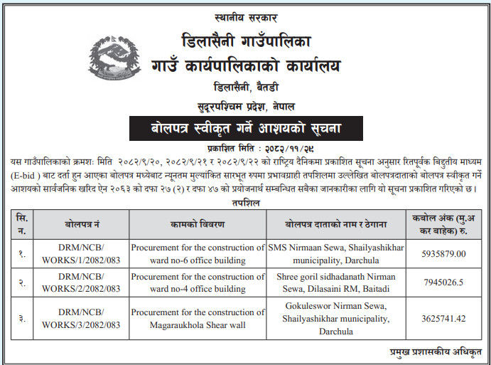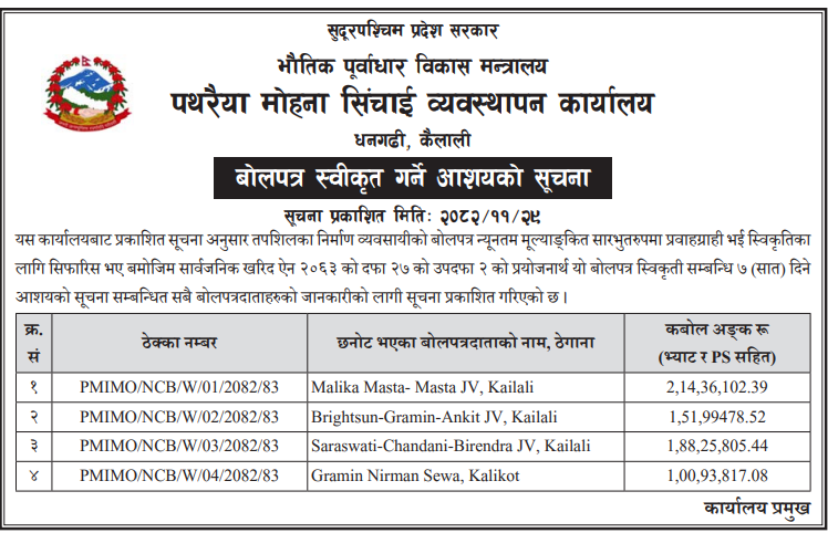 प्रदेश ७ मा प्रकाशित निर्माण सम्बन्धी बोलपत्र तथा आशयका सुचनाहरु