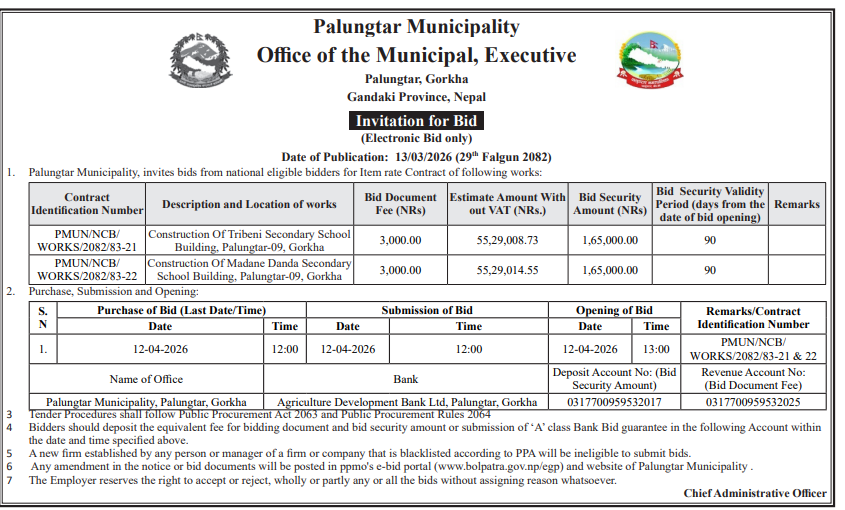 | 41 | Myanglung Municipality Office, Koshi Province, TERHATHUM; | Wadaa Karyalaya Bhawan Nirman,Myanglung 8 | 12/03/2026 | PPMO | 29/03/2026 | Click Here | |