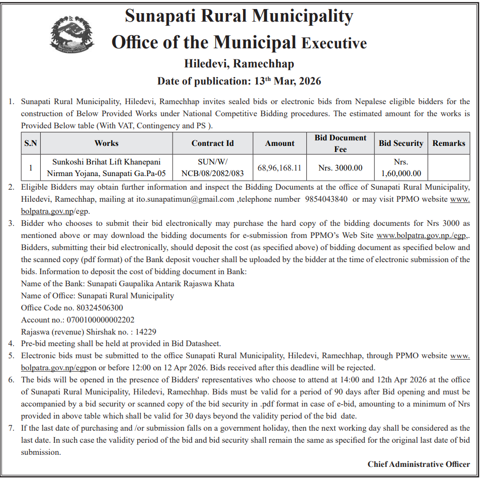 | 43 | Myanglung Municipality Office, Koshi Province, TERHATHUM; | Jirikhimti Asoch Griha Bhawan Nirman | 12/03/2026 | PPMO | 29/03/2026 | Click Here | |