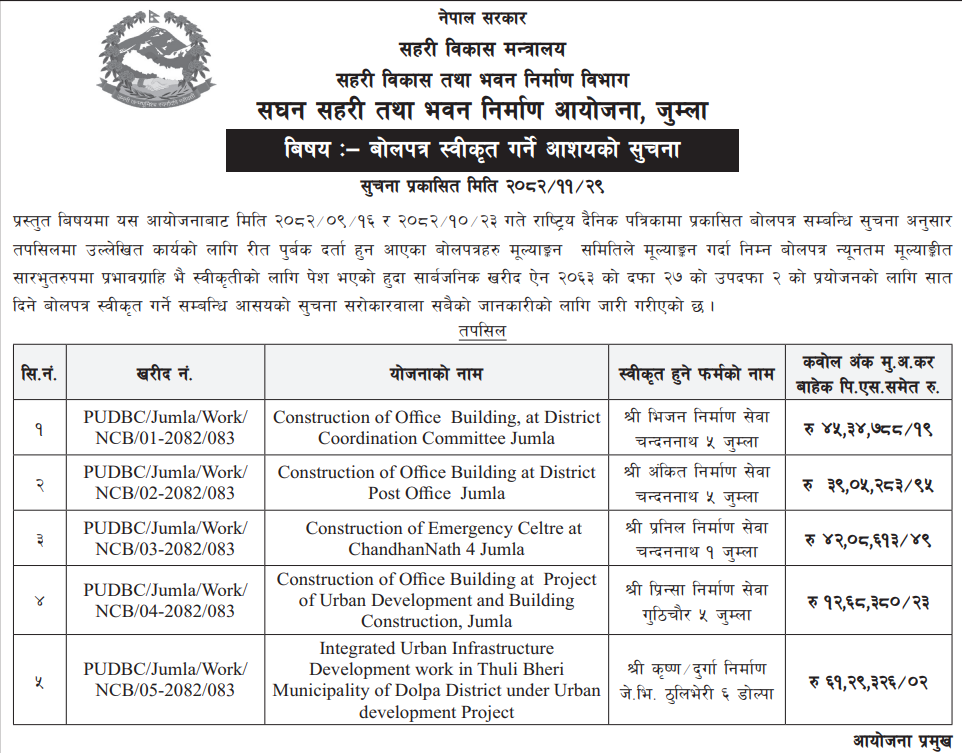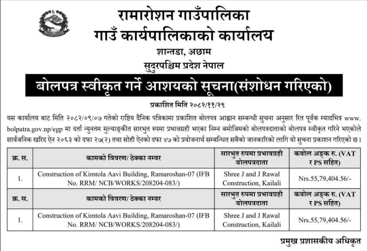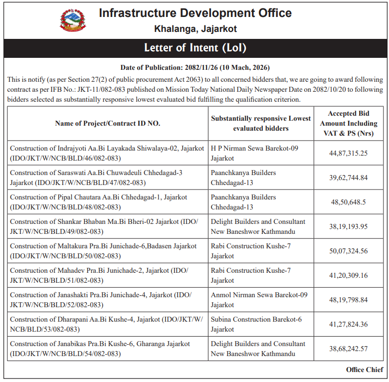 | 5 | Chaurjahari Municipality Office, Karnali Province, RUKUM WEST; | Construction of Quarter Block Second package With Finishing Chaurjahari Municipality Rukum West. | 12/03/2026 | PPMO | 12/04/2026 | Click Here | |