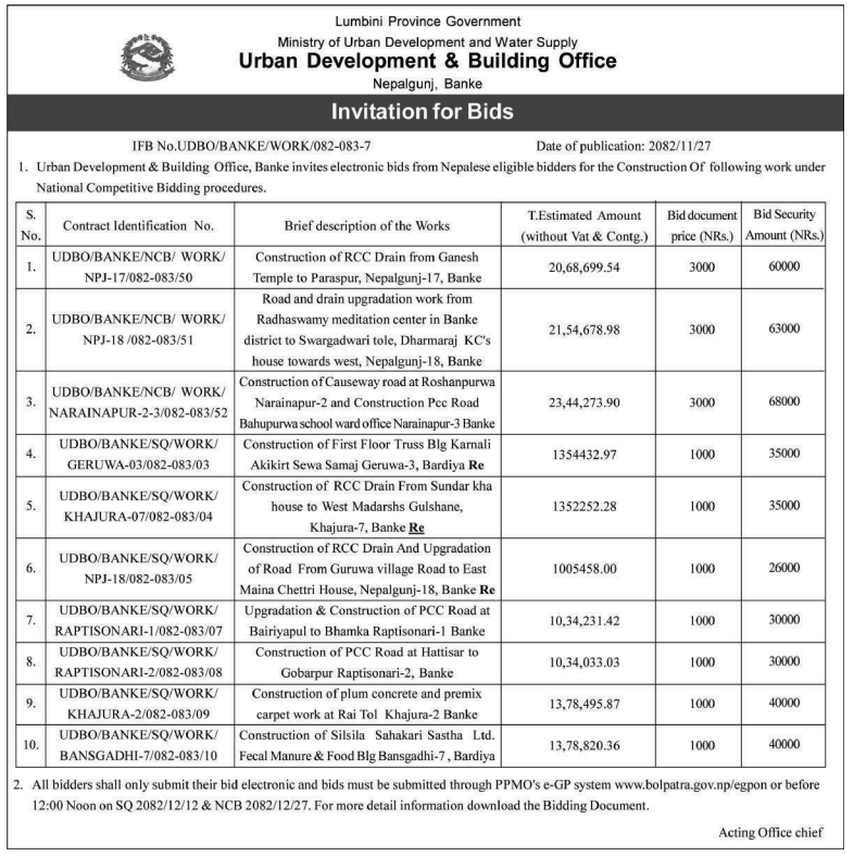 | 77 | Infrastructure Development Office, Banke | RCC Drain & Gravel (Sub Base) Works at Basuki Marg Istit Rabita Regmi ra Jit Bahadur Khatri ko ghar ko bich ma chowk dekhi pachhim tarfa Dr.Prabin Yogi ko ghar hudai uttar pachhim ma parne dondra nala tarfa Mina Bhusal ko ghar samma, Janaki-03 | 12/03/2026 | PPMO | 29/03/2026 | Click Here | |