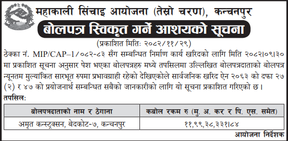 | 91 | Water resources and Irrigation Development Division Kapilvastu | Construction of Canal and Associated Structures of Shringighat Irrigation Project, Banganga, Kapilvastu | 12/03/2026 | PPMO | 29/03/2026 | Click Here | |