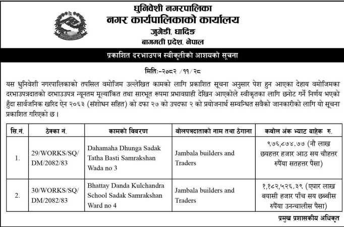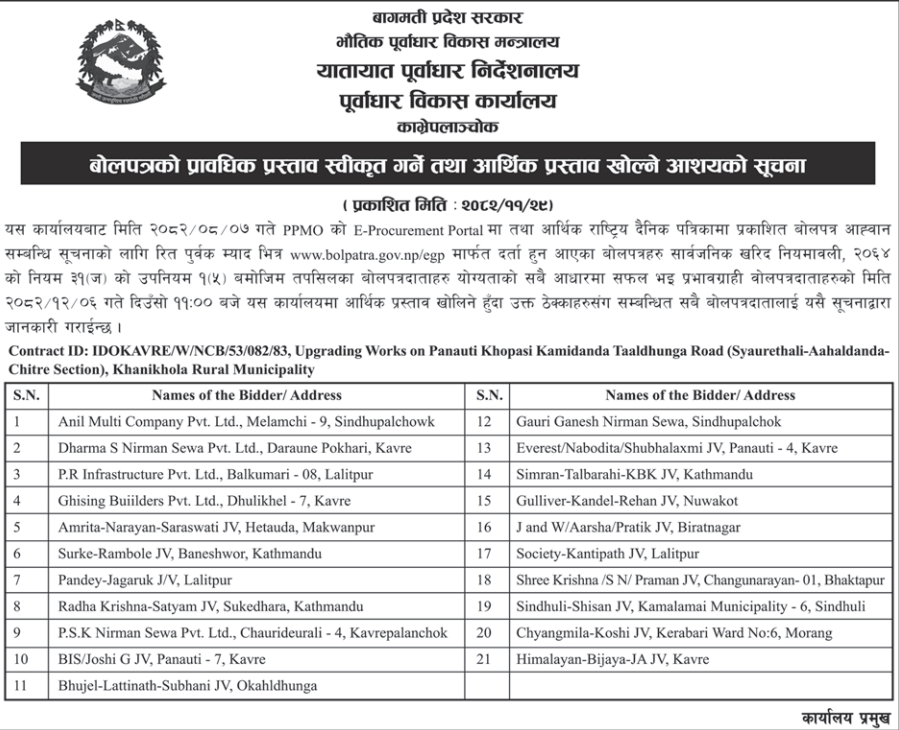 | 18 | IDOKASKI | Road construction from Sada Shiva School to Muli Swara Pokhara - 24 and construction of motor road from Pokhari Chaur to Bukunwara, Pokhara - 24 | 12/03/2026 | PPMO | 12/04/2026 | Click Here | |