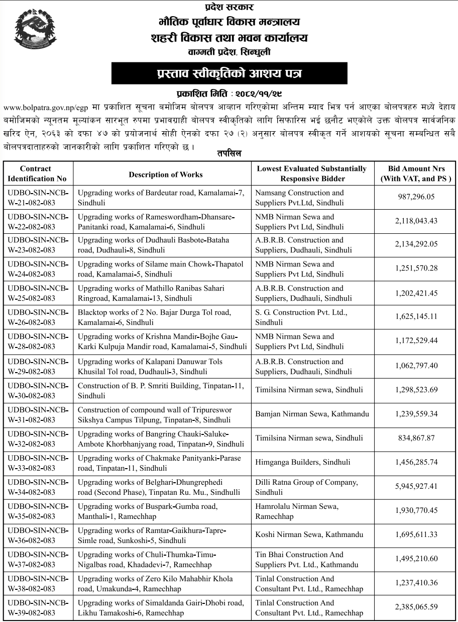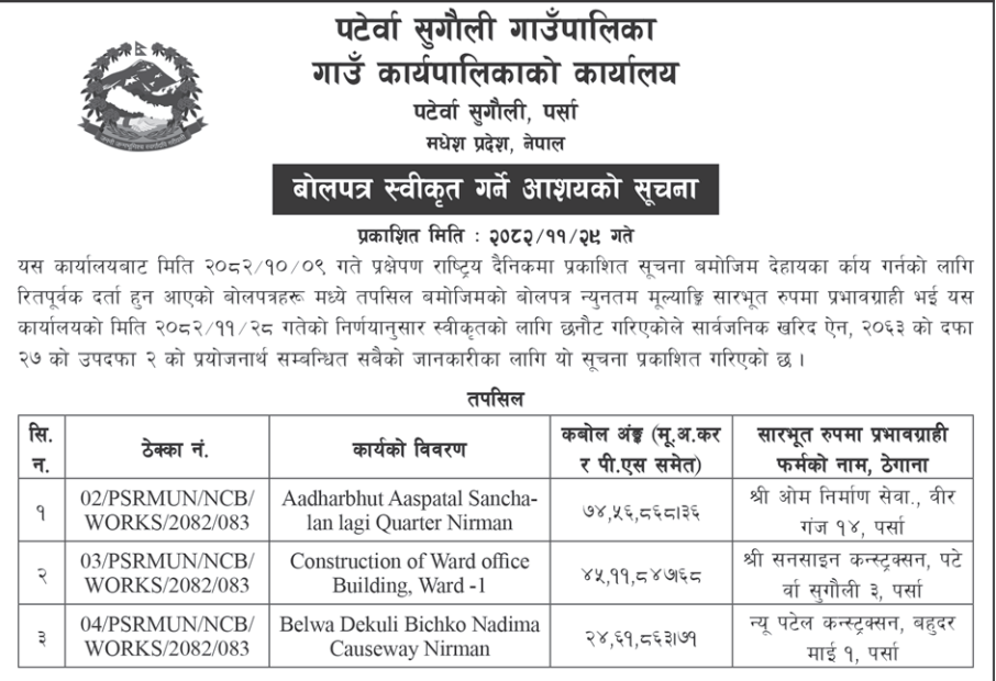 | 40 | Devchuli Municipality, Nawalparasi-East | Jan-jyoti chowk thapa chautari dekhi bhagwati mandir samma bato istarunnati ra Prakriti tol dekhi Gas uddhog jane bato istro unnati Ward-10 | 12/03/2026 | PPMO | 29/03/2026 | Click Here | |