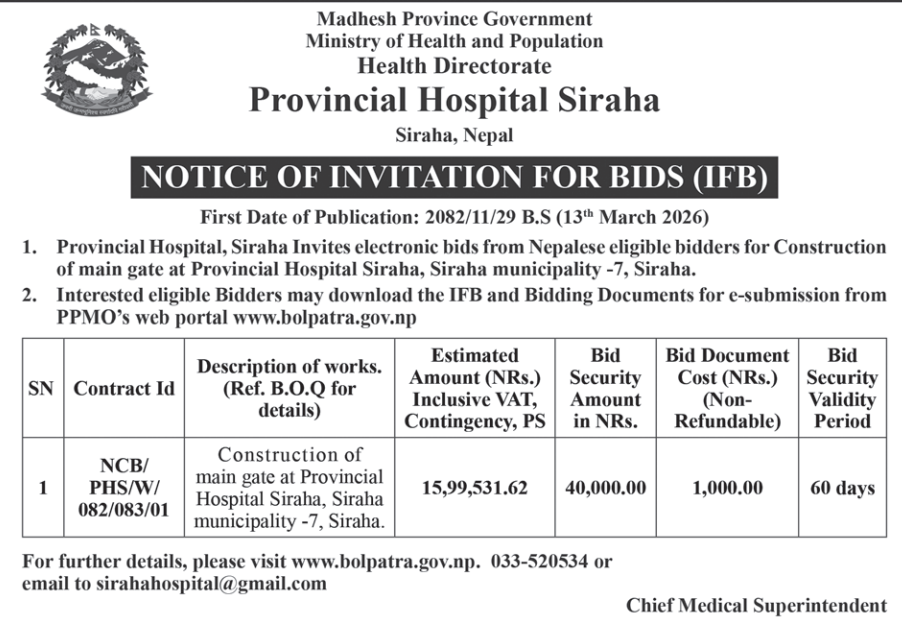 | 107 | Road Division, Sanphebagar | Up-grading road and drain of malangwa municipality ward no 02,03,08 Nepal Bank Ltd chauk to West Rajkishor ray house to North Malangwa Na.pa. chauk & Malangwa Municipality ward no 04 & 07 Ram Brikchh ray house to north-west ganesiya upto chulhai ray house | 12/03/2026 | PPMO | 26/03/2026 | Click Here | |