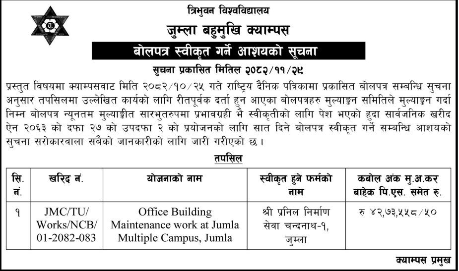 | 6 | Chankheli Rural Municipality Office, Karnali Province, HUMLA; | Kawad Hall Nirman Yojana | 12/03/2026 | PPMO | 12/04/2026 | Click Here | |