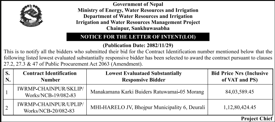 | 25 | Irrigation and Water Resource management Project, Mugu | Construction of Gabion Revetment for River Training Khatyad River Training Work, Khatyad, Mugu District | 12/03/2026 | PPMO | 12/04/2026 | Click Here | |