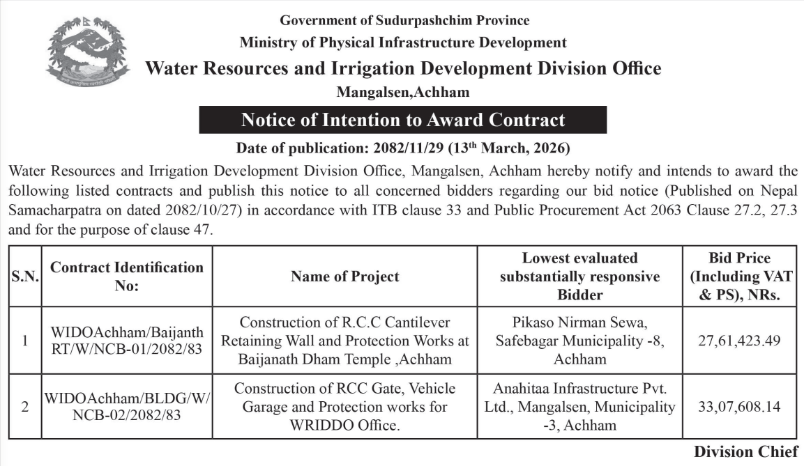 | 24 | Irrigation and water Resources Management Project, Dadeldhura | Construction of Launching with Gabion Reventment wall | 12/03/2026 | PPMO | 12/04/2026 | Click Here | |