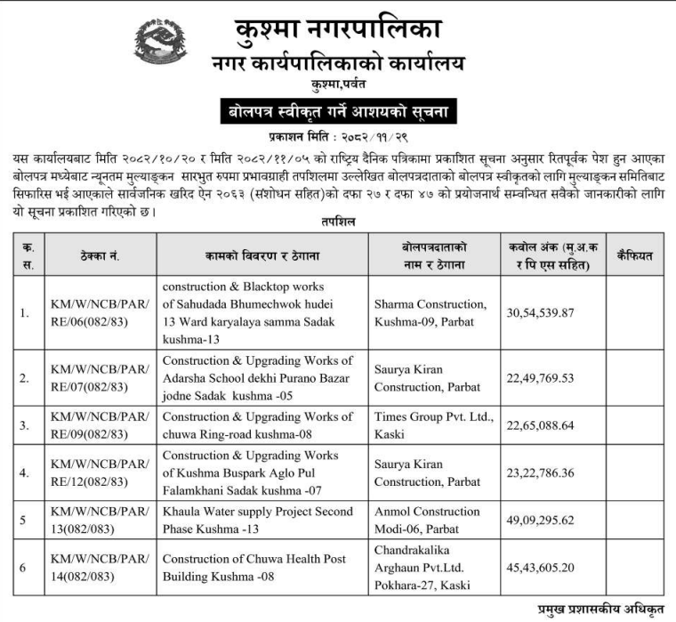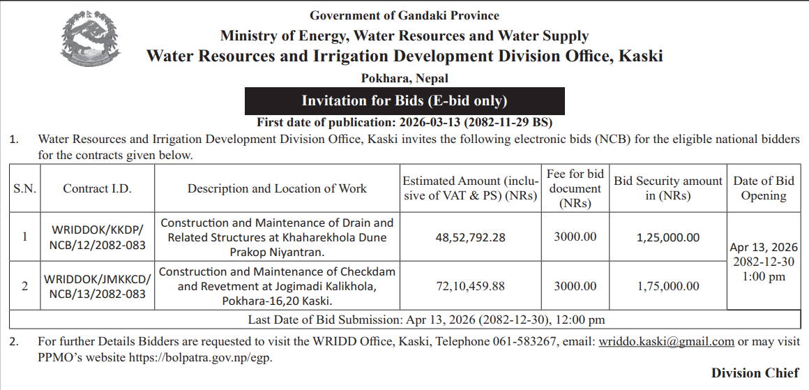 | 12 | IDOKASKI | Kahukhola-Sikles-Dudhpokhari Sadak Marmat Sambhar Madi Ga.Pa. (Pahilo Khanda), Kaski | 12/03/2026 | PPMO | 12/04/2026 | Click Here | |