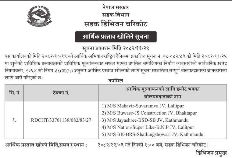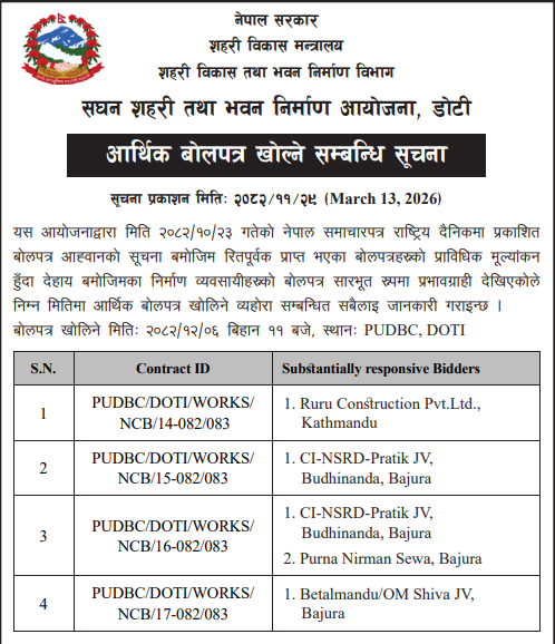 | 37 | Dullu Municipality Office, Karnali Province, DAILEKH; | Bajad Deutichaur Dabbazar to Bhaneshwor Road Upgrading works | 12/03/2026 | PPMO | 12/04/2026 | Click Here | |