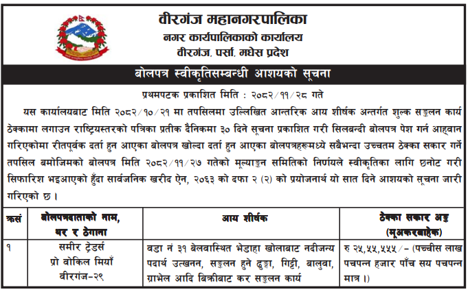 | 128 | Thaha Municipality Office, Makawanpur | Collection of export Tax for Vegitables,Herbs,Recycled materials and Animals. | 12/03/2026 | PPMO | 12/04/2026 | Click Here | |