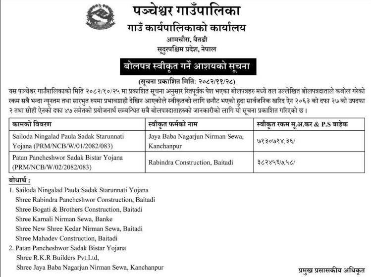 | 99 | Punarbas Municipality Office, Sudurpaschim Province, KANCHANPUR; | Construction of Incomplete Blacktop Road Kankad Godawari Houses Punarbas-08, Kanchanpur. | 12/03/2026 | PPMO | 27/03/2026 | Click Here | |